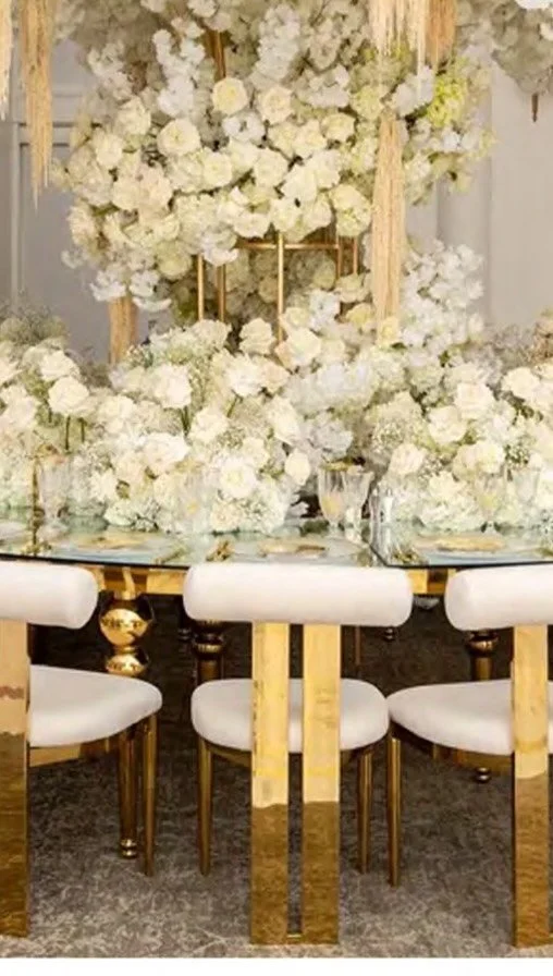 Our signature Mello collection, featuring alternating blush and ivory dining chairs, created a sophisticated foundation for the tablescape. The ribbed texture and contemporary silhouette of these pieces added depth and modern refinement to the setting. Paired with our Pearl Olivia dining tables, elegantly wrapped in a custom-designed floral print, this combination served as the ideal foundation for the event planner's creative vision, allowing the breathtaking floral installations to shine as the focal point.